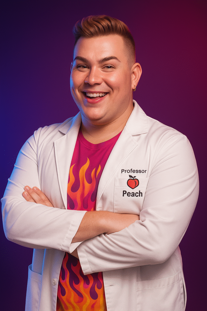 He teaches confidence, backdoor basics, queer joy, and the art of shaking that peach proudly “don’t be shy, baby everyone starts somewhere.”