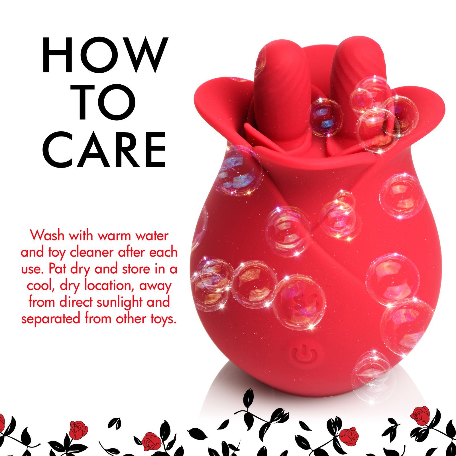 A new kind of blossom, this rose massages your most sensitive of places with two, textured nubs that rub it back and forth! The soft petals of this premium, phthalate-free silicone rose gently brush against your lips as you receive a sensual massage from these little fingers. Enjoy 3 speeds and 7 patterns of vibration and massage that rumbles from the palm of your hand directly into your erogenous zone below. Take it in the shower or bathtub, too! It is rated as IPX7 waterproof so it can be submerged underwater for up to 30 minutes! Recharge after use with the USB cable provided. After playing with this small, discreet, travel-friendly toy, immediately wash it with mild soap and warm water. Spray it with a toy cleaner and pat dry before storing in a cool, dark place.