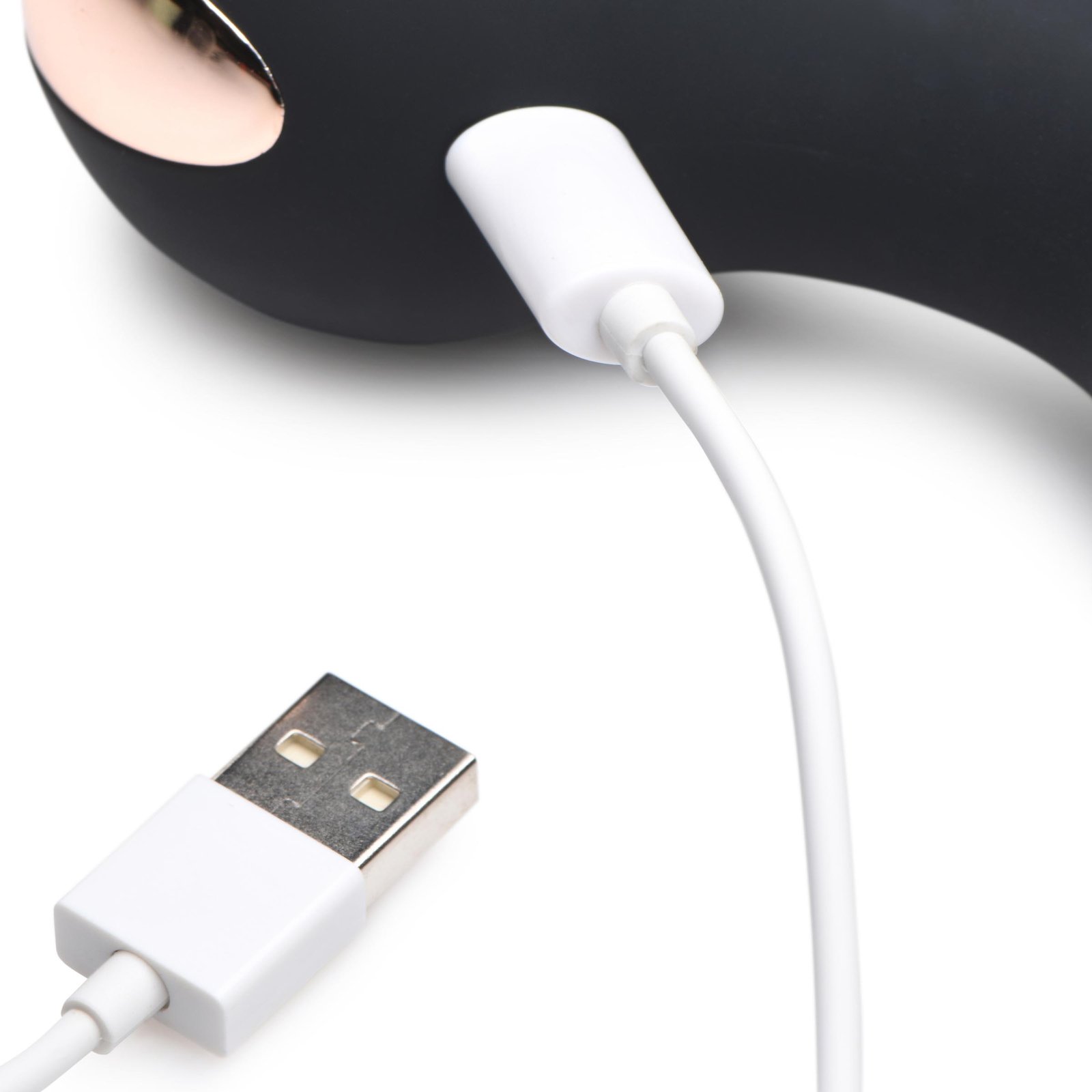 Get the trifecta of vibrating pleasure with this Triple Stim Silicone Vibrator! The shaft has a large, bulbous end that fills you up and stimulates your G-spot! Feel the buzzing vibration of 5 speeds and 5 patterns that you mix and match for your ultimate pleasure! It doesn’t stop there; you also have a slim, flanged base that has two different stimulating features. On one side there are concentric circles of ridges and this texture rubs against your clit for dual stimulation. On the other side you have a slim stem that you can insert in your anus for triple stimulation where all three of your sensitive spots can feel delicious, rumbling vibes! Made of premium silicone, this silky smooth and sexy toy is also phthalate-free and body-safe. Use only with water-based lubricants for best results. Take it in the shower for even more fun! It’s rated as IPX6 waterproof so it can withstand strong jet streams. Recharge between uses with the USB cable provided. Wash the toy after every use with warm water and soap, then spray with a toy cleaner and wipe dry before storing. Using your favorite lube, get the shaft, the clitoral pad and the anal stem nice and slippery. Then, turn the rumbling vibes on and begin massaging your clit and labia until you begin to get wet and open up. As you part those lips, enjoy the feeling of being stretched gently open and the pressure from the bulb pushing against your G-spot. Massage that spot and begin to milk it so you feel that orgasmic pressure building. Then, slip it deeper inside and feel the rumbling vibes on your clit, as well. Finally, guide the anal stem inside your backdoor and remember to breathe deep so you can really enjoy the moans coming from your lips as this toy brings you over the edge of pleasure! Measurements: Overall length: 8.7 inches, Insertable length: 5 inches, Widest insertable diameter: 1.7 inches Materials: Silicone, ABS plastic Color: Black Note: Waterproof rating of IPX6: can handle strong jet streams, do not submerge in water. Use only with water-based lubricants.