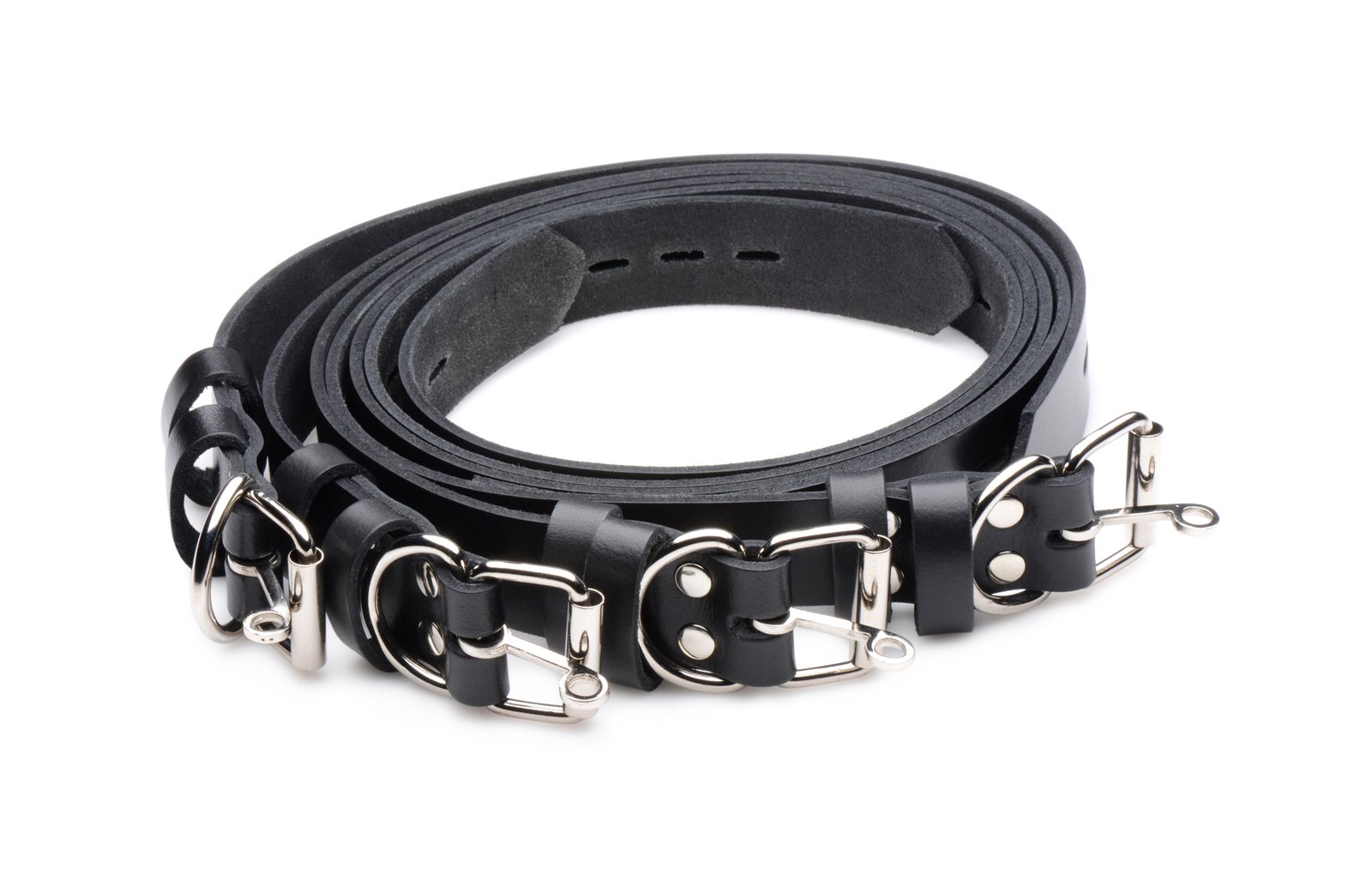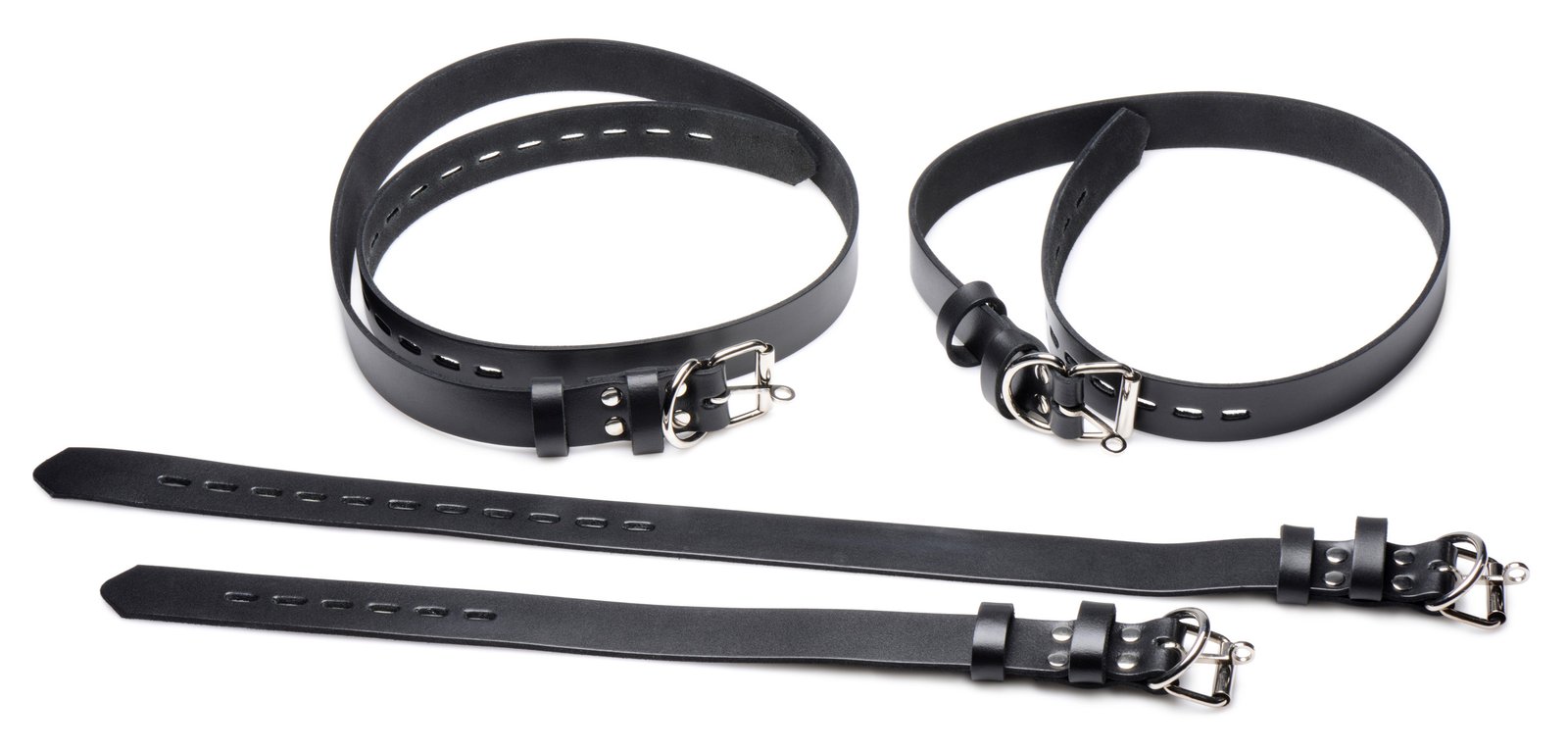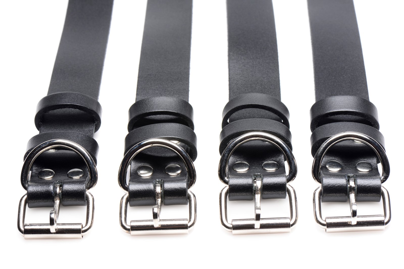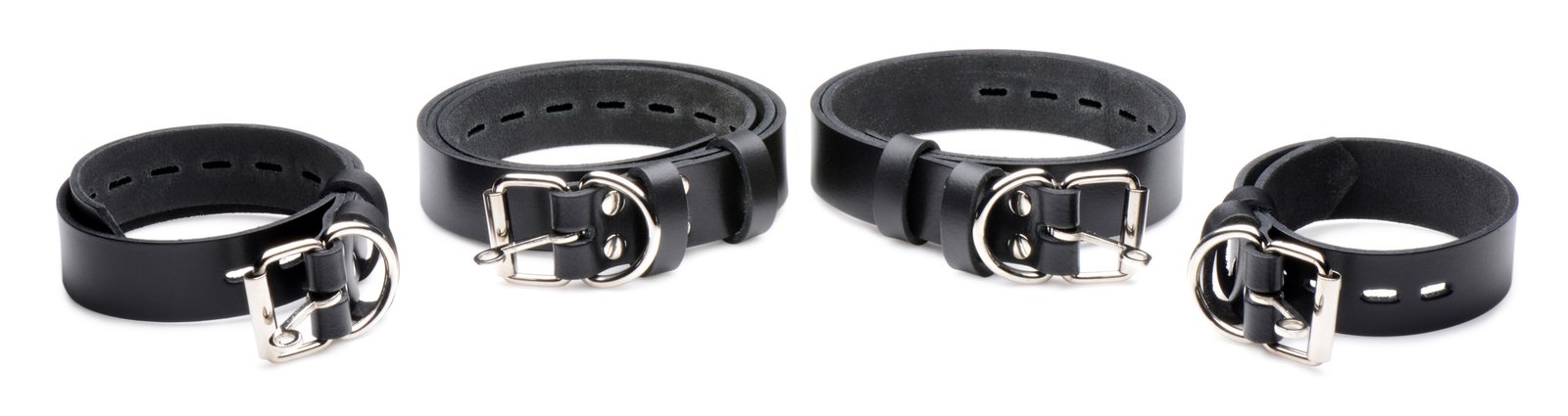 This versatile set of straps provides you with 4 Leather Bondage Straps of different lengths so you can explore and restrain with greater freedom. Use these straps to restrain different body parts or in combination with other bondage delights! Mentally and physically restrain your partner thanks to the lockable feature found on each buckle – adjust the thightness of the strap and attach a small padlock to keep the strap in place until your scene is finished! Measurements : Materials : Leather, metal Color : Black Key Features: 4 Straps of Varying Size: Ranging from short to long to give you plenty of options to wrap around your partners body to lock them down or hold them in place for your enjoyment Sturdy Lockable Buckles: Each strap features a lockable buckle designed to accomodate small padlocks to physically and mentally lock your partner in place; padlocks not included Perfect For All Skill Levels: Experts will enjoy the different lengths of each strap, and beginners will love the versatility this set of four provides for them in the bedroom Dependable Materials: Constructed with a dependable leather and metal hardware so you can pull and resist against these straps with confidence