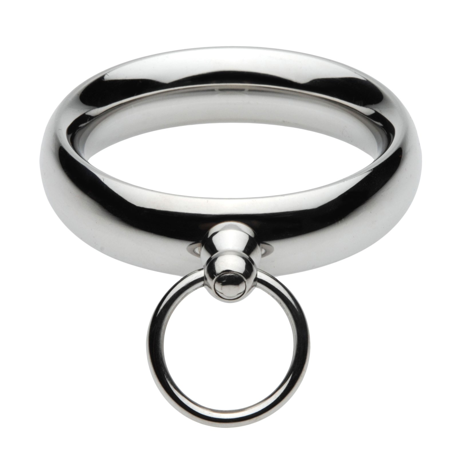 This versatile cock ring is a heavyweight way to enjoy erection enhancement while adding style and functionality The O-ring at the front will set the mood as a statement piece, or act as a versatile anchor point for ropes, chains, clamps, or other bondage accessories. Get creative Chain them to the wall or force them to bend over in supplication to you. The smooth, weighty steel is temperature sensitive and can be heated up or cooled down as you desire. Measurements: 1.75 inches in diameter Material: Stainless steel Color: Grey Note: One cock ring included