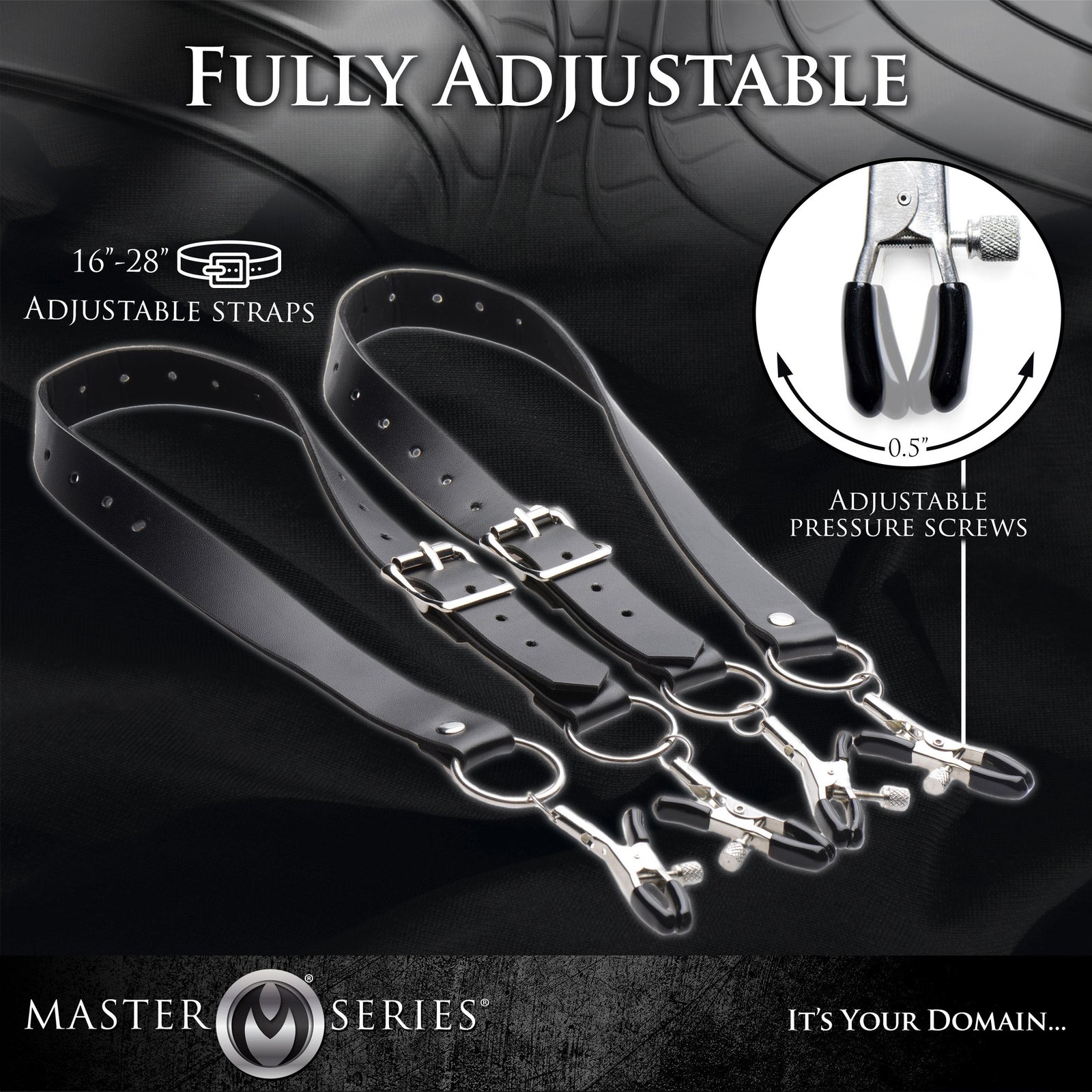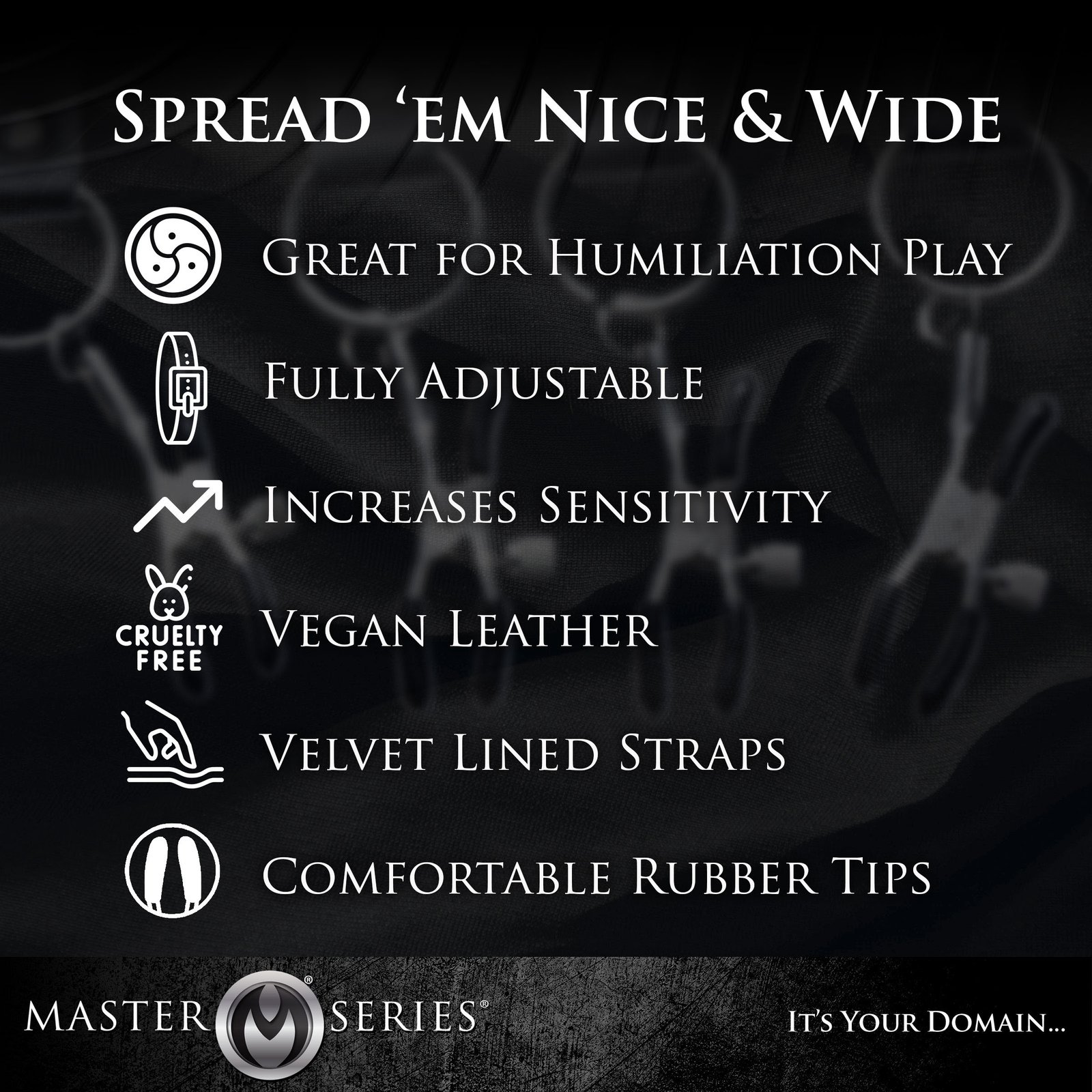 Turn up the intensity of your kinkiest scenes with these unique straps, designed to wrap around your thighs, clamp onto your labia, and spread them open Perfect for humiliation play, gynecological roleplay, or whatever wicked fantasies you want to bring to life, this unique set keeps your partners genitals ultra sensitive and helplessly exposed like never before. The straps are lined on the interior with a velvety softness and have buckles to adjust the fit around your thighs. The rubber-tipped clamps have thumb screws that adjust their pressure. Get creative with your BDSM scenarios Measurements: Adjusts from 16 to 28 inches between the tip of each clamp. Material: PU leather, metal. Color: Black.