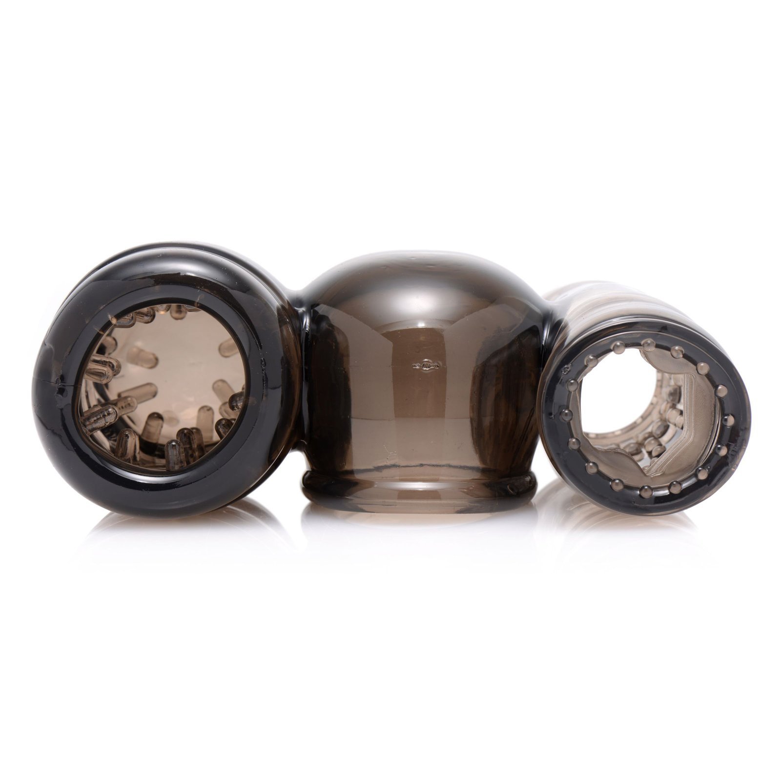 How long can you withstand this accessory that turns a massage wand into two tantalizing male sex toys? Perfect for orgasm denial or forced orgasm on your own or with a partner, this attachment slips easily over the head of a standard sized wand vibrator, providing two textured strokers that will thrum with the same incredible power as your massager. One stroker features a closed cup to target the head of the penis for pleasure, lined with soft tendrils to tickle and tease. The other stroker is open-ended to pleasure the entire shaft, lined with stimulating nubs for an unbearably intense massage with every thrust. Endure extreme vibrating ecstasy for as long as you can before exploding Made of phthalate-free TPE, this pleasure tool can be used with both silicone and water-based lubricants. Measurements: Open end is 3.5 inches in length, 1.25 inches in diameter, unstretched. Closed end is 3.75 inches in length, 1.5 inches in diameter, unstretched. Material: TPE. Color: Black. Note: Wand massager is not included.
