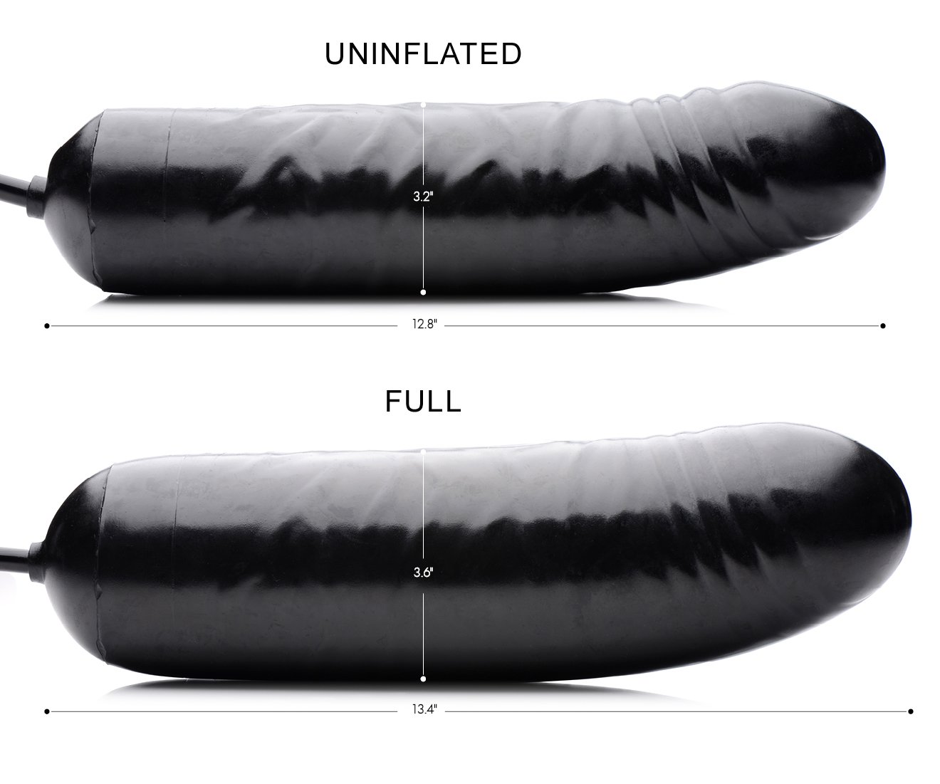 Let this XXL inflatable dildo carry you away to ecstasy on a cloud of air. The solid rubber skin allows for the firmness needed when driving such a large dildo home, but remains malleable once inflated, allowing the air inside to flex and curve with your body. The thickness of the skin and the cushion of air inside makes for a soft but stiff quality that will drive you wild with pleasure. Just pump the dildo up with the included ball and valve system, and you are ready for a night of earth shattering insertion. Once the fun is over, the quick release valve lets you deflated the dildo quickly and completely. Measurements: 12.5 inches in length, approximately 3 inches in diameter inflated. Material: Rubber and ABS plastic. Color: Black. Note: This dildo does not have a solid inner core, and is designed to be used when inflated